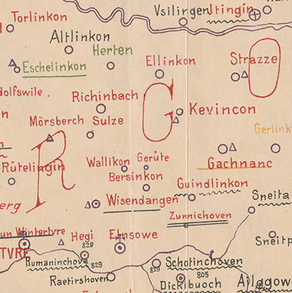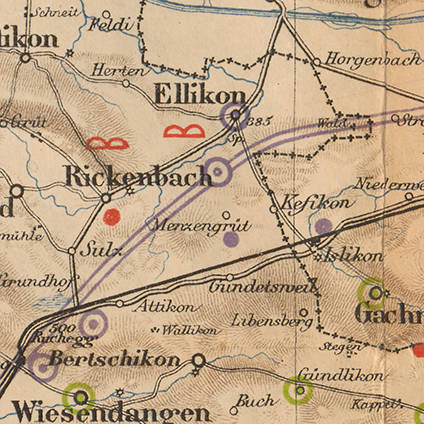 Ein Ausschnitt von 1894 aus : «J. Heierli: Archäologische Karte des Kantons Zürich.» Die farbigen Markierungen bezeichnen übrigens archäologische Fundstellen.