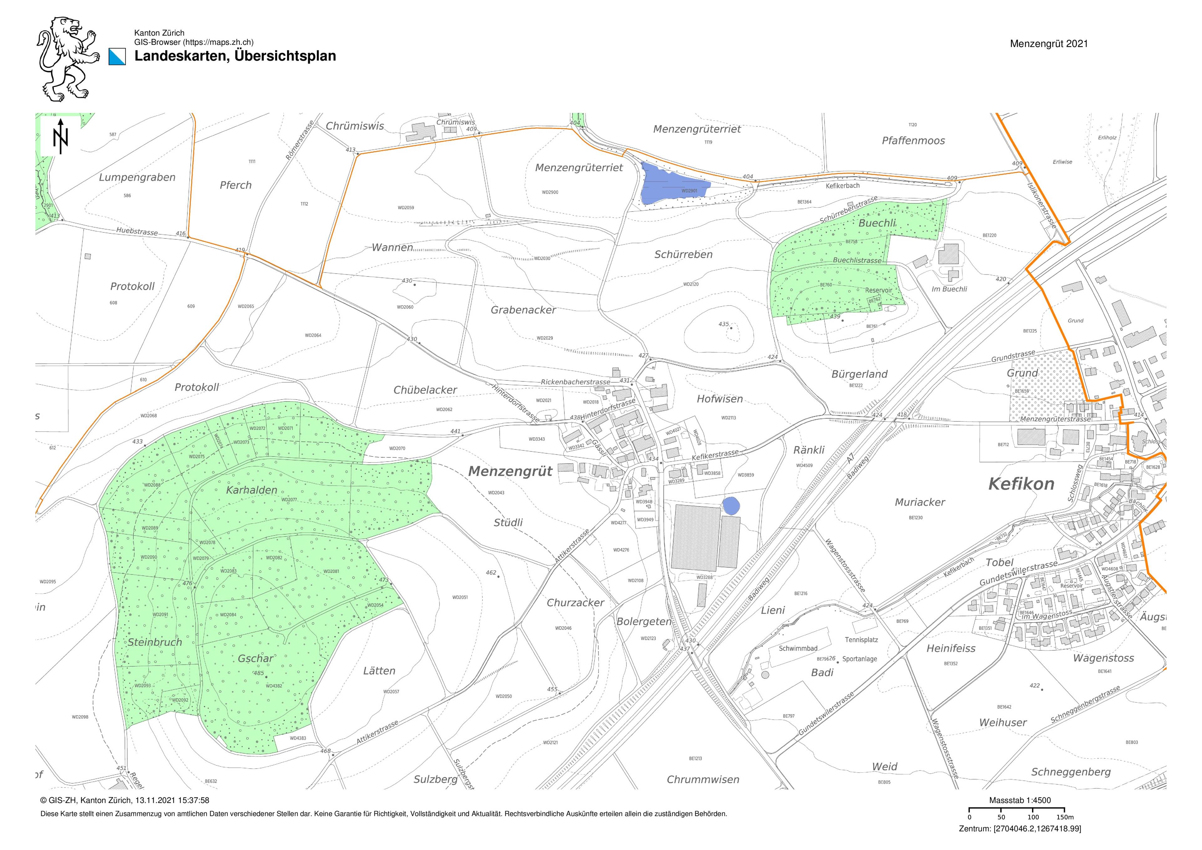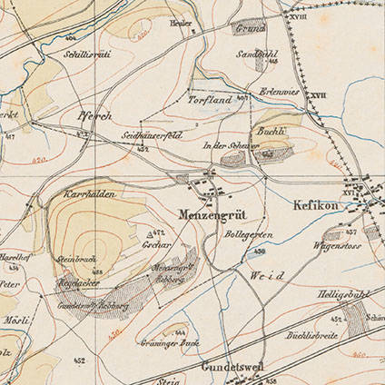 Es sieht schon besser aus! In Menzengrüt sind bereits einige Häuser verzeichnet. Rund ums Dorf fallen die vielen Rebberge auf und in der nördlichen Senke ist statt dem heutigen Naturschutzgebiet "Torfland" vermerkt. Ebenfalls interessant ist der Verlauf der Strasse von «Gundetsweil» nach Menzengrüt, bzw. die fehlende Verbindung zu Kefikon. Und Im Wald ob Menzengrüt ist ein Steinbruch eingetragen.